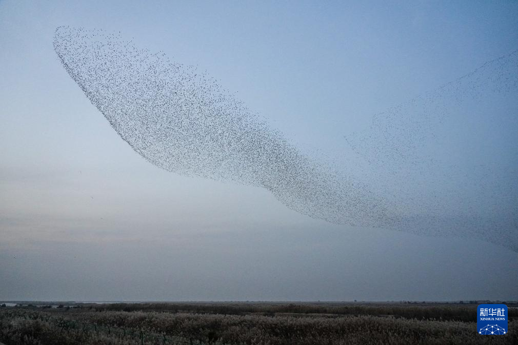 11月12日,在黄河三角洲国家级自然保护区,飞翔的候鸟形成“鸟浪”景象。