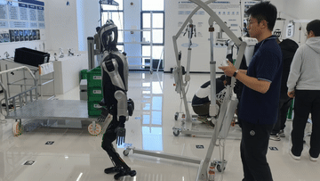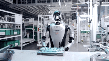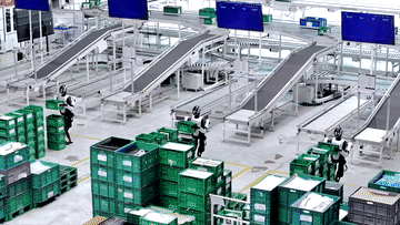 “夸父”人形机器人在工厂进行实地测试,搬运塑料箱。