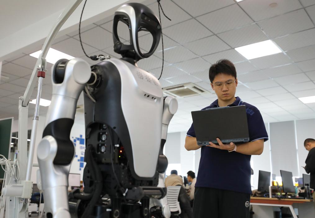 张鸿伟查看电脑上人形机器人的运行数据。