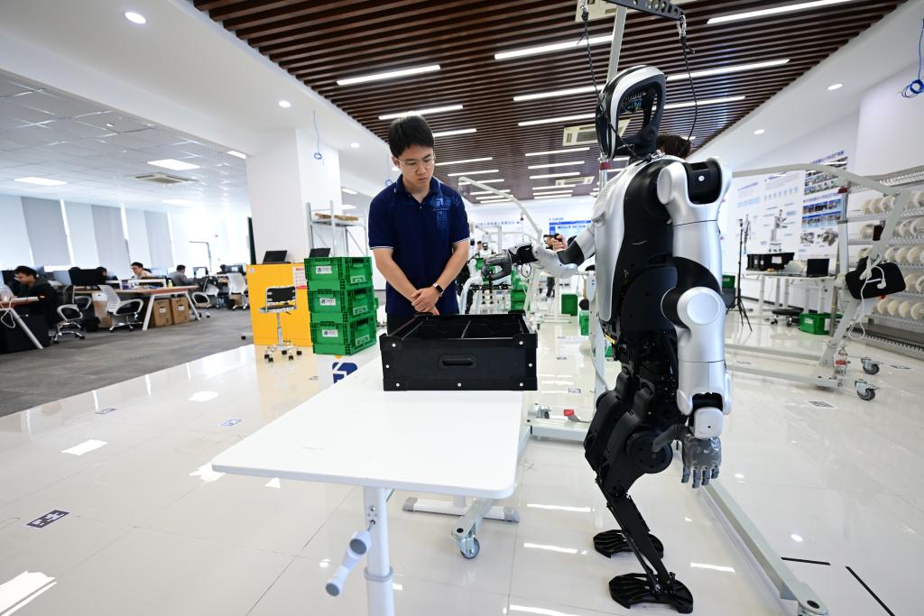 张鸿伟在公司实验区域操控人形机器人,准备进行测试。