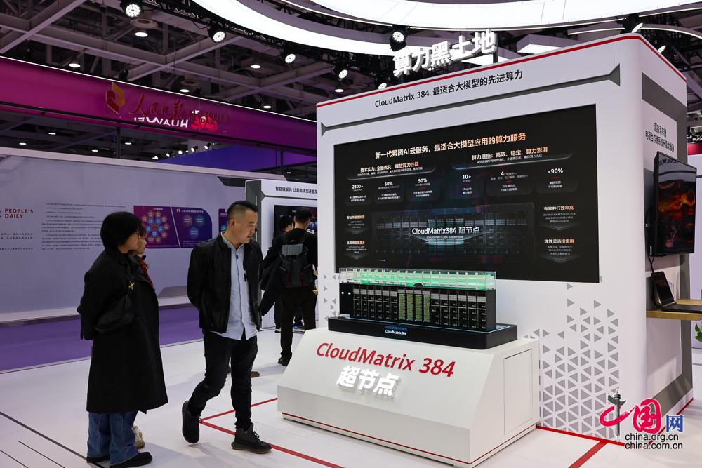 11月12日,观众在2025中国新媒体技术展华为展台观看昇腾384超节点,该产品基于超节点架构,通过总线技术实现384个NPU之间的大带宽低时延互联,解决集群内计算、存储等各资源之间的通信瓶颈。通过系统工程的优化,实现资源的高效调度,让超节点像一台计算机一样工作。中国网记者 董宁 摄影