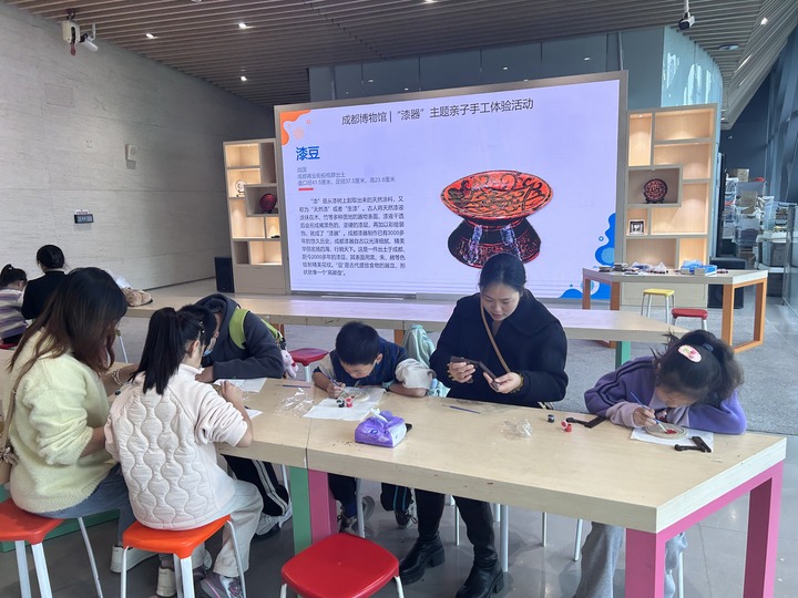 11月13日,成都博物馆内,孩子们在家长陪伴下参加手工体验活动。新华社记者 赵怡宁 摄