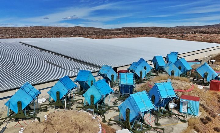 蓝箱子里的广角切伦科夫望远镜构成广角切伦科夫望远镜阵列(2025年10月28日摄,无人机照片)。新华社记者 刘坤 摄