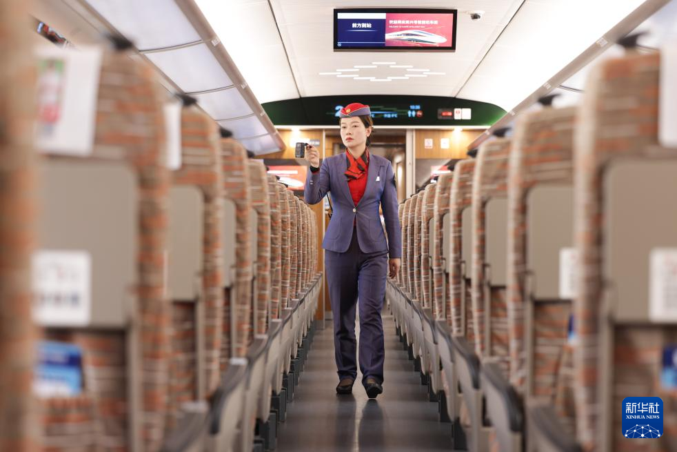 11月17日,工作人员在一列试验动车组上查看车辆运行情况。