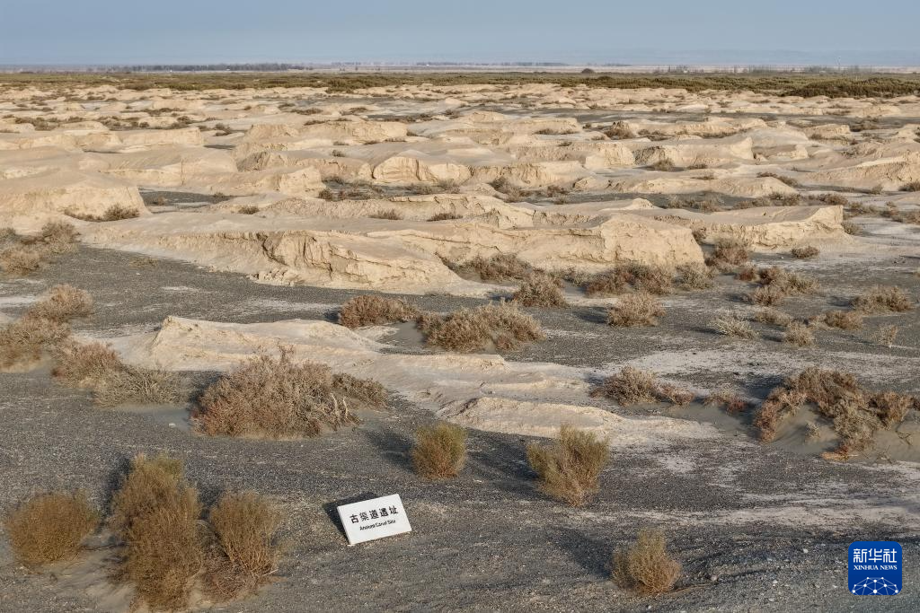 这是11月18日在甘肃省瓜州县拍摄的农业灌溉渠系遗迹中的古渠道遗址(无人机照片)。