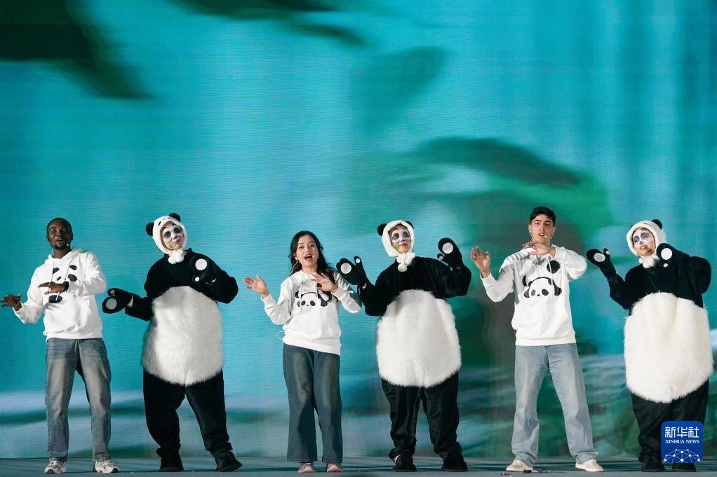 11月21日,外国留学生代表在2025全球熊猫伙伴大会开幕式上演唱大会主题曲。