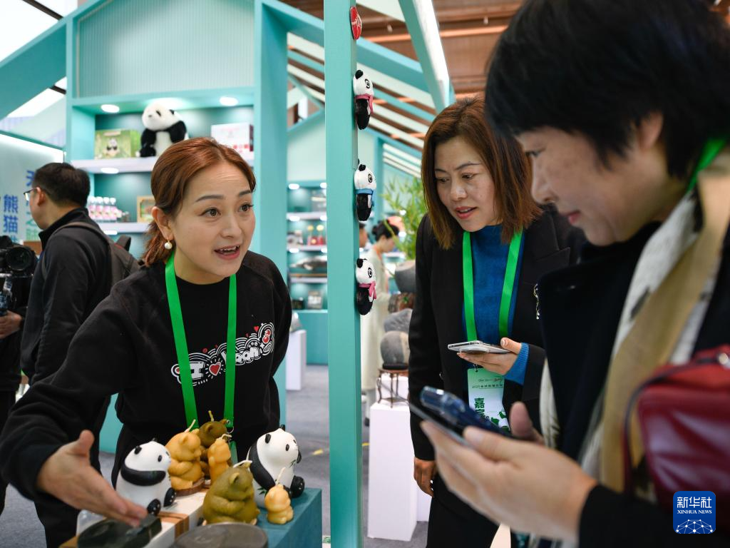 11月21日,在熊猫文创集市上,来自四川雅安的参展商为嘉宾介绍由大熊猫粪便制作的熊猫造型香薰蜡烛。