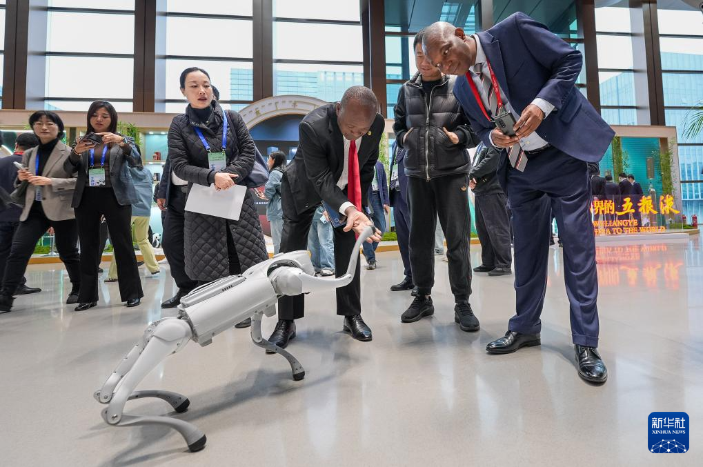 11月21日,在2025全球熊猫伙伴大会,嘉宾与机器人互动。