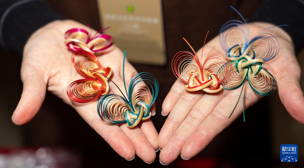11月21日,在北京故宫文创融合馆举行的“海派匠心·艺韵共融”上海市残疾人文化艺术作品展上,一名艺术家展示竹编作品。