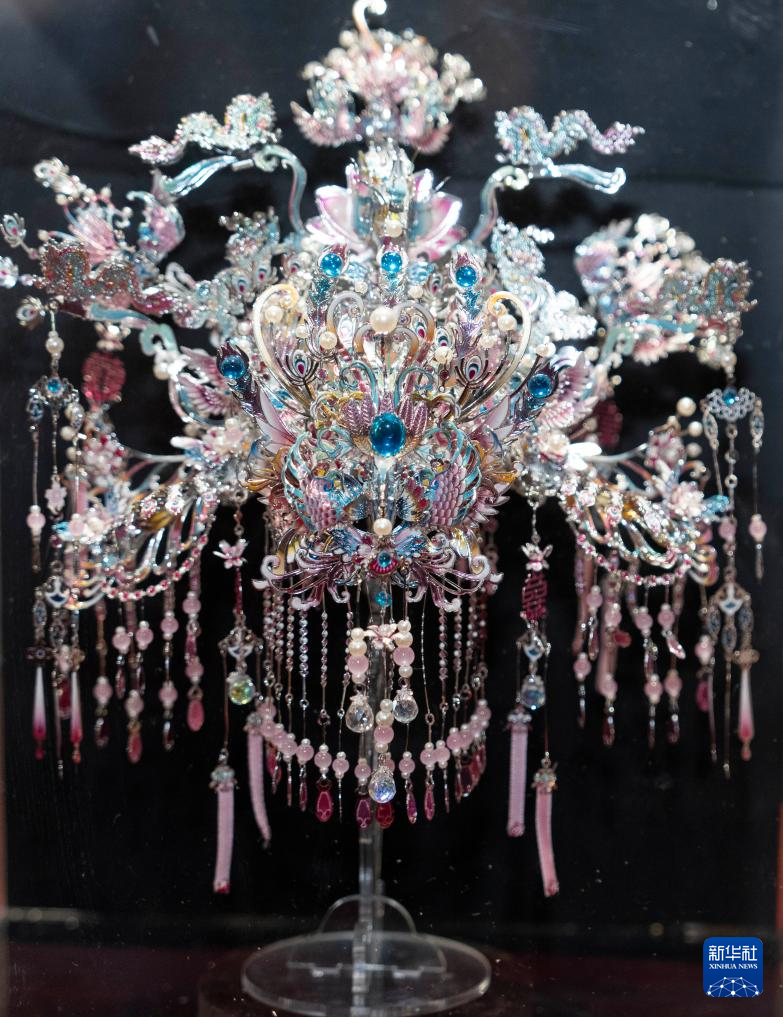 这是11月21日在北京故宫文创融合馆举行的“海派匠心·艺韵共融”上海市残疾人文化艺术作品展上拍摄的“紫鸾凤冠”作品。