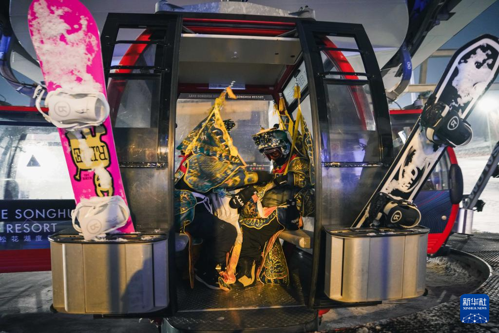 11月21日,滑雪者身着京剧服饰乘坐缆车。