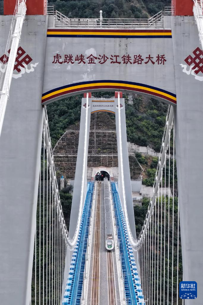 11月21日,动车组列车通过虎跳峡金沙江铁路大桥(无人机照片)。