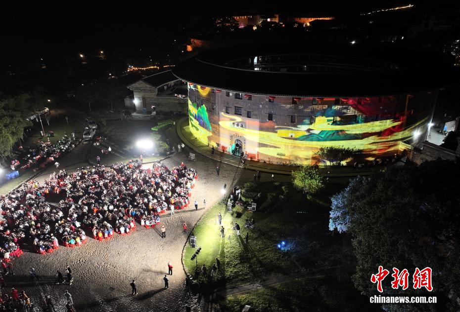11月22日晚,“土楼大福宴”在“土楼王子”振成楼前热闹开席,以客家传统宴席迎接参加2025福建永定土楼半程马拉松赛的选手。