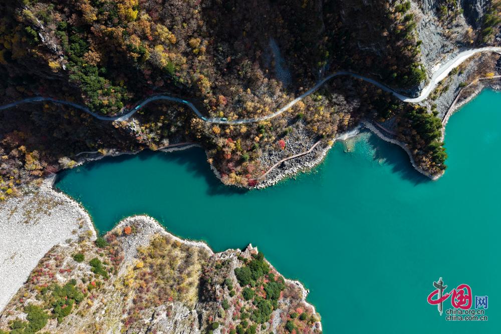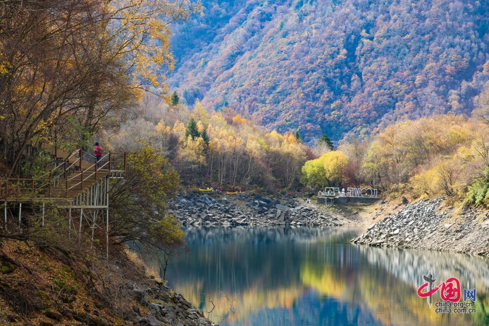 11月19日,四川省茂县松坪沟风景区美景如画,澄澈海子倒映漫坡彩叶,斑斓色彩浸满湖面,潺潺溪水在林间穿梭,游客漫步其中,流连忘返。中国网记者 董宁 摄影