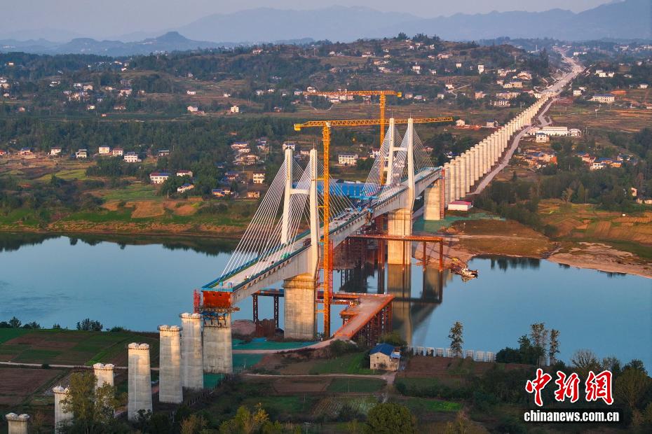 11月26日,经过建设工人12小时的连续浇筑作业,四川成都至达州至重庆万州高速铁路(简称“成达万高铁”)渠江特大桥顺利合龙。该桥采用双线高铁预应力混凝土箱梁矮塔斜拉桥设计,结构设计科学合理。成达万高铁是中国“八纵八横”高速铁路网沿江通道的重要组成部分,正线全长477公里,设计时速350公里。图为合龙后的成达万高铁渠江特大桥。(无人机照片)