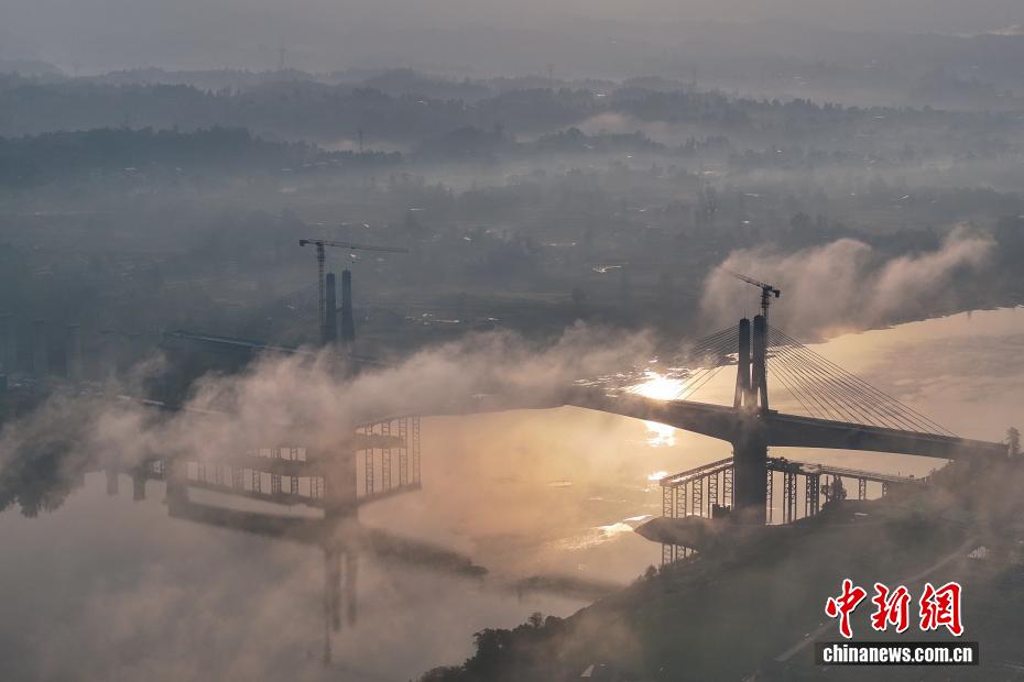 11月26日,经过建设工人12小时的连续浇筑作业,四川成都至达州至重庆万州高速铁路(简称“成达万高铁”)渠江特大桥顺利合龙。该桥采用双线高铁预应力混凝土箱梁矮塔斜拉桥设计,结构设计科学合理。成达万高铁是中国“八纵八横”高速铁路网沿江通道的重要组成部分,正线全长477公里,设计时速350公里。图为清晨云雾和朝阳中的渠江特大桥。(无人机照片)