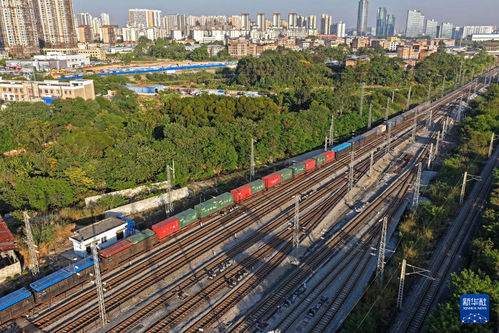 一列中越班列驶出南宁国际铁路港(11月28日摄,无人机照片)。