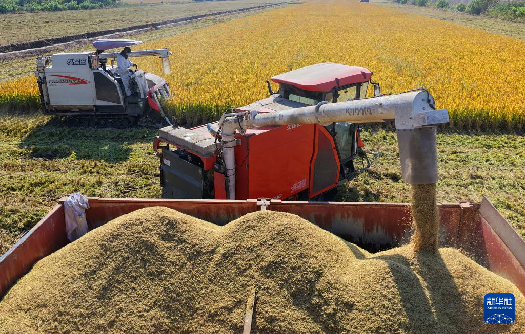 11月5日,江苏省农垦农业发展股份有限公司南通分公司收割机卸运刚刚收割的水稻(无人机照片)。