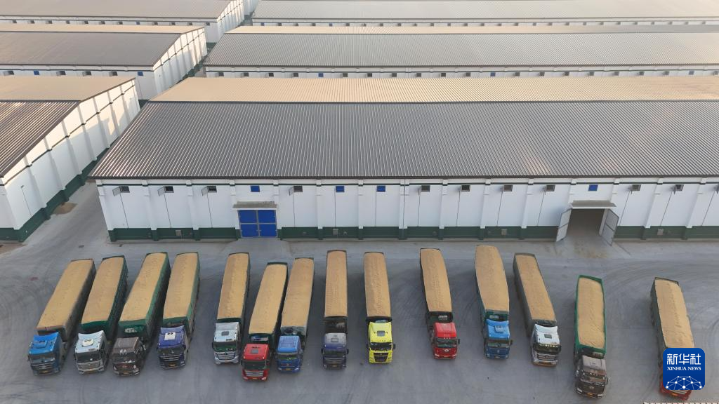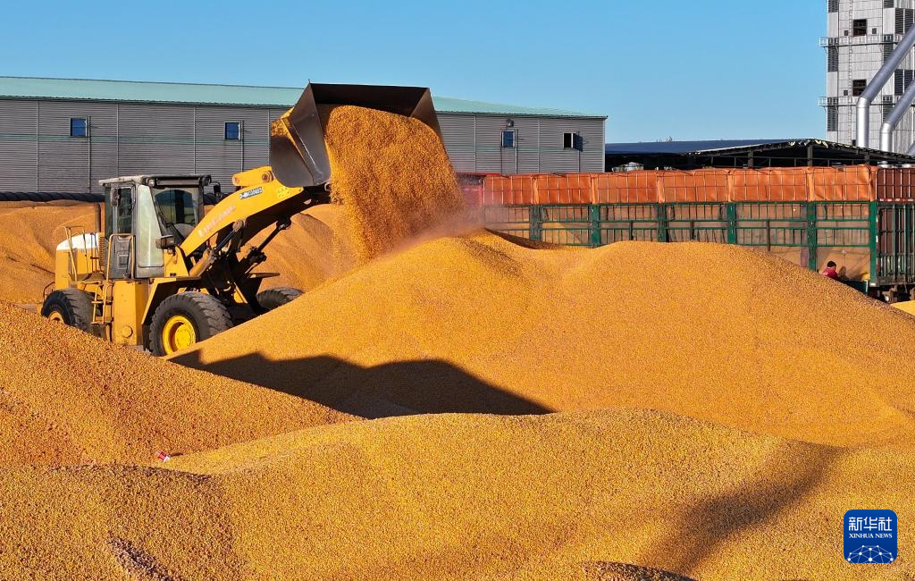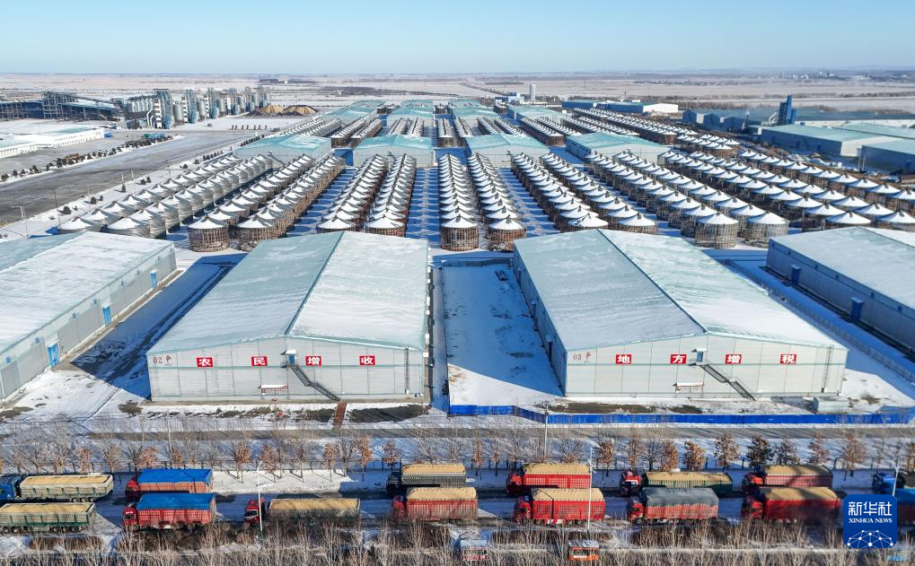 这是11月12日拍摄的黑龙江汤原鹤立国家粮食储备库有限责任公司内粮食收储的场景(无人机照片)。