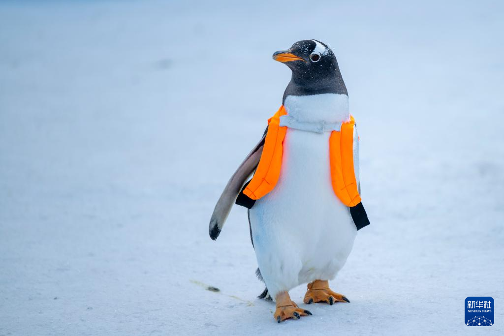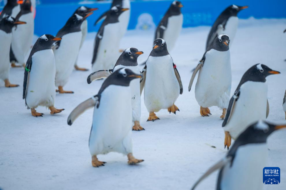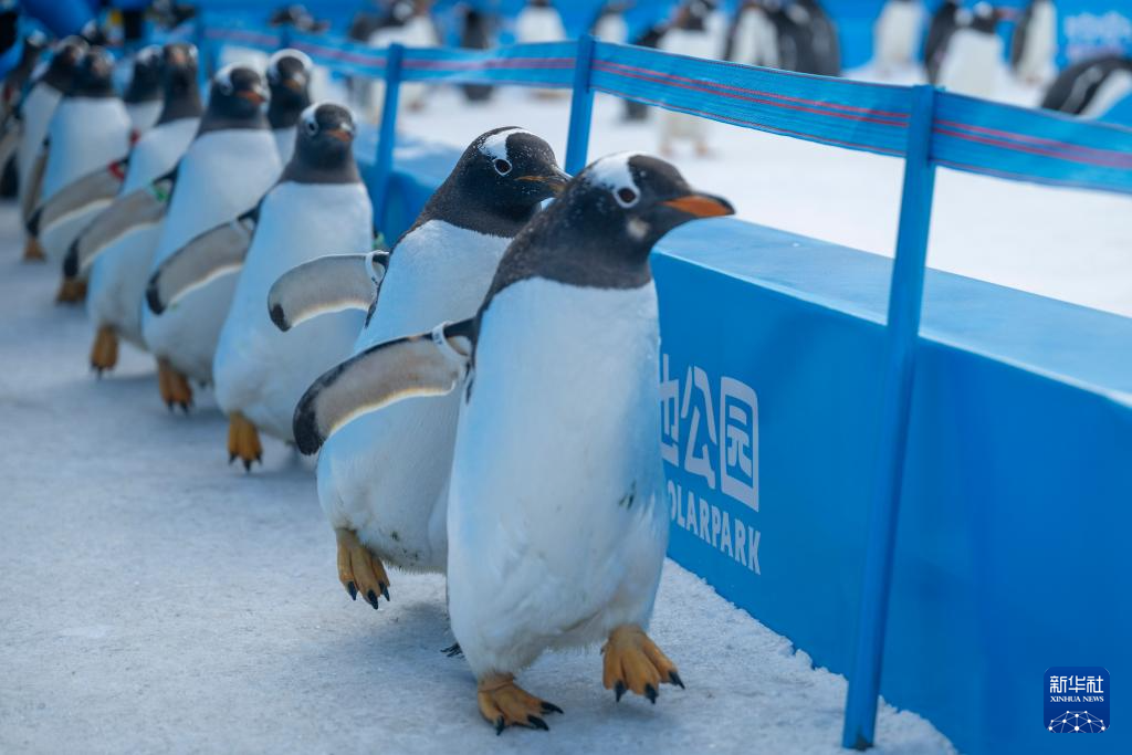 12月13日,哈尔滨极地公园的企鹅在户外进行巡游。
