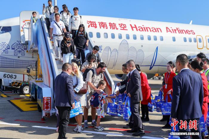 图为搭乘海南航空从曼谷抵达海口美兰国际机场的外籍旅客。中新社记者 骆云飞 摄