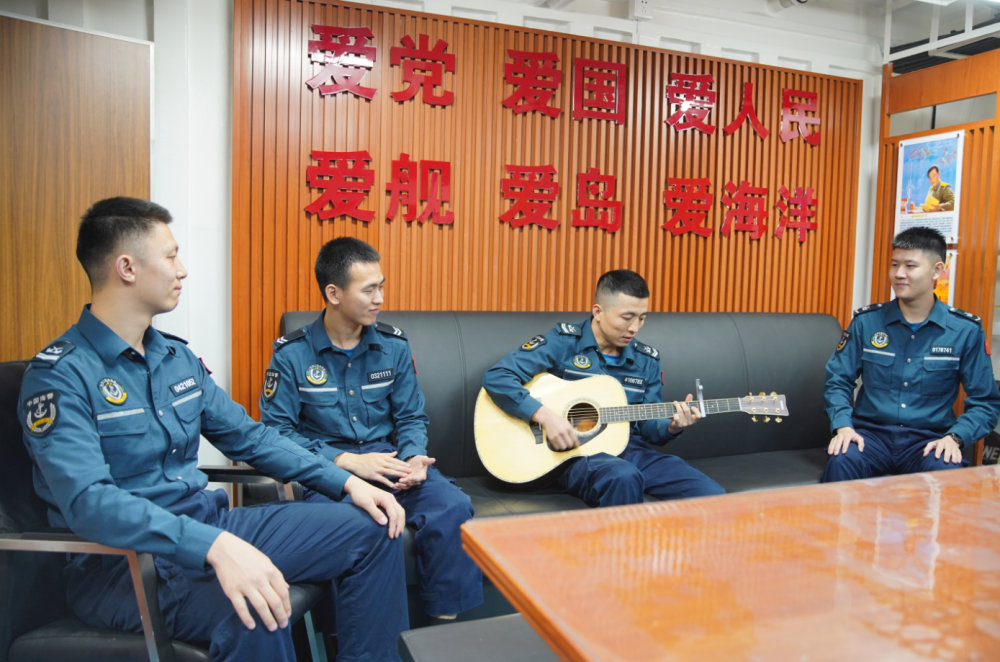 12月31日,在中国南沙仙宾礁附近海域,海警浮鹰舰执法员尹年辉(右二)在文娱室弹吉他。新华社记者赵文轩摄