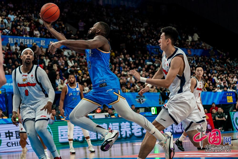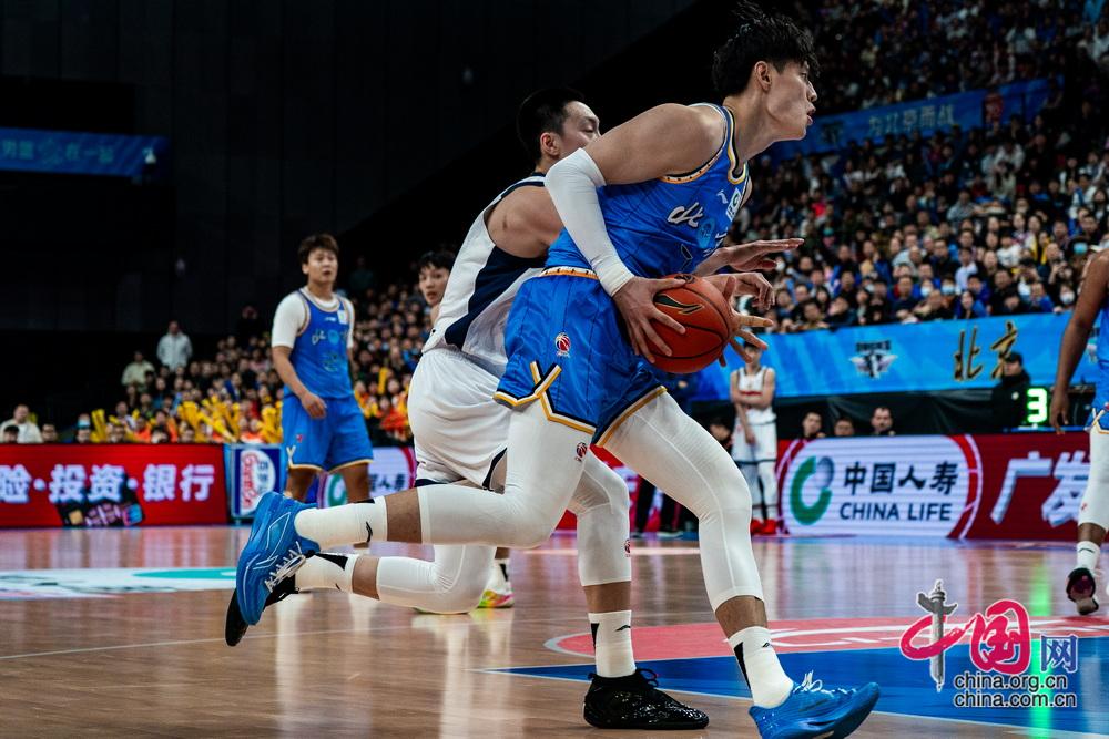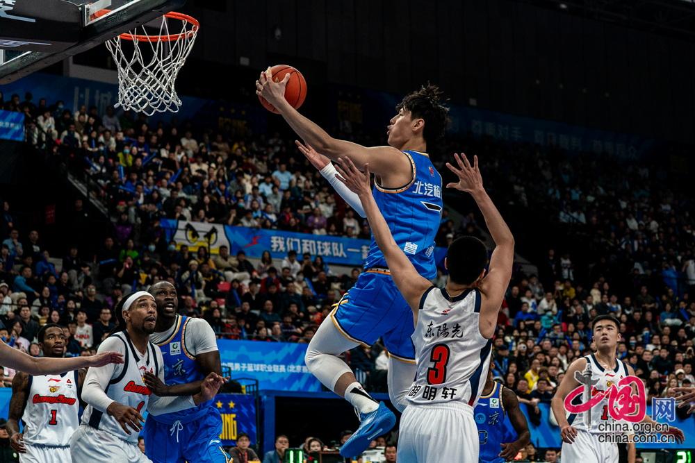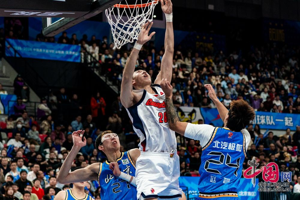 2026年1月1日,北京北汽男篮主场以105比74大胜广东男篮。图为广东队王少杰篮下强攻。中国网记者 郑亮摄