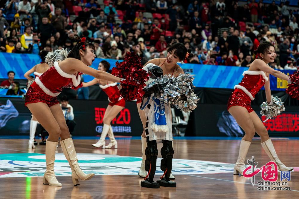 2026年1月1日,北京北汽男篮主场以105比74大胜广东男篮。图为中场休息时天宫机器人与啦啦队共同表演。中国网记者 郑亮摄