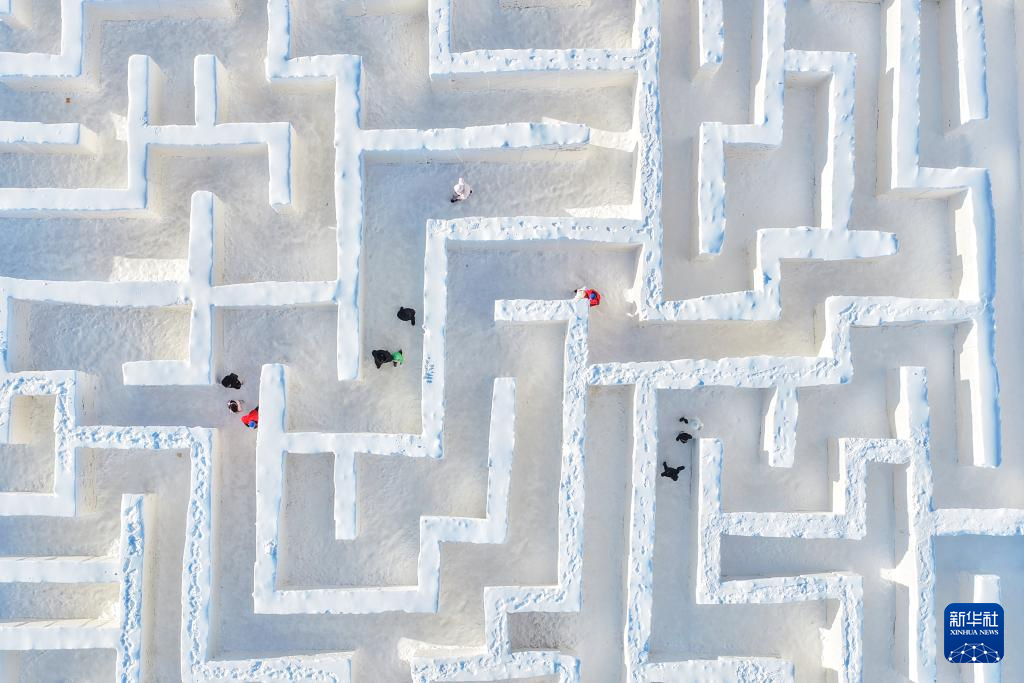 1月2日,在黑龙江省同江市俄罗斯风情园,游人在冰雪迷宫里游玩(无人机照片)。