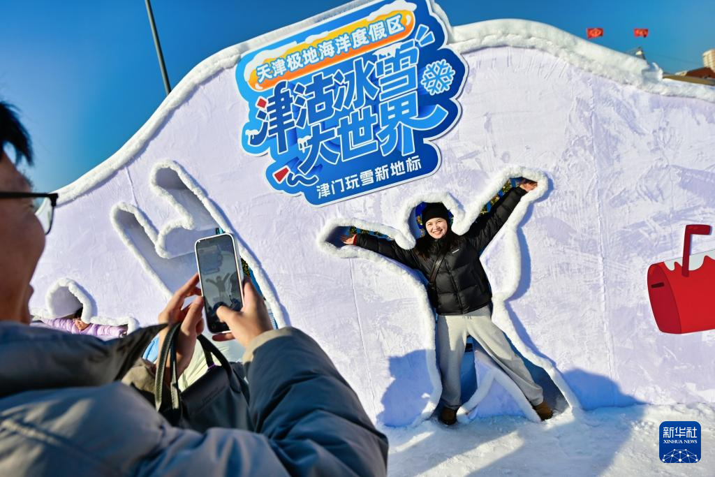 1月2日,游客在天津市滨海新区极地海洋度假区拍照打卡。