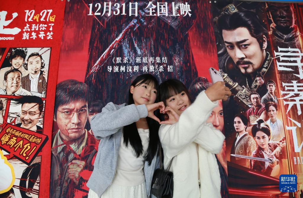 1月1日,在云南省蒙自市一家电影院,观众与电影海报合影。