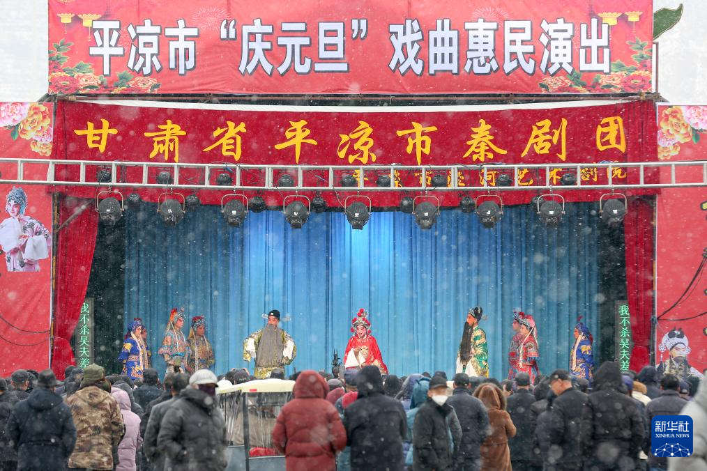 1月2日,在甘肃省平凉市崆峒区,人们冒雪观看戏曲惠民演出。