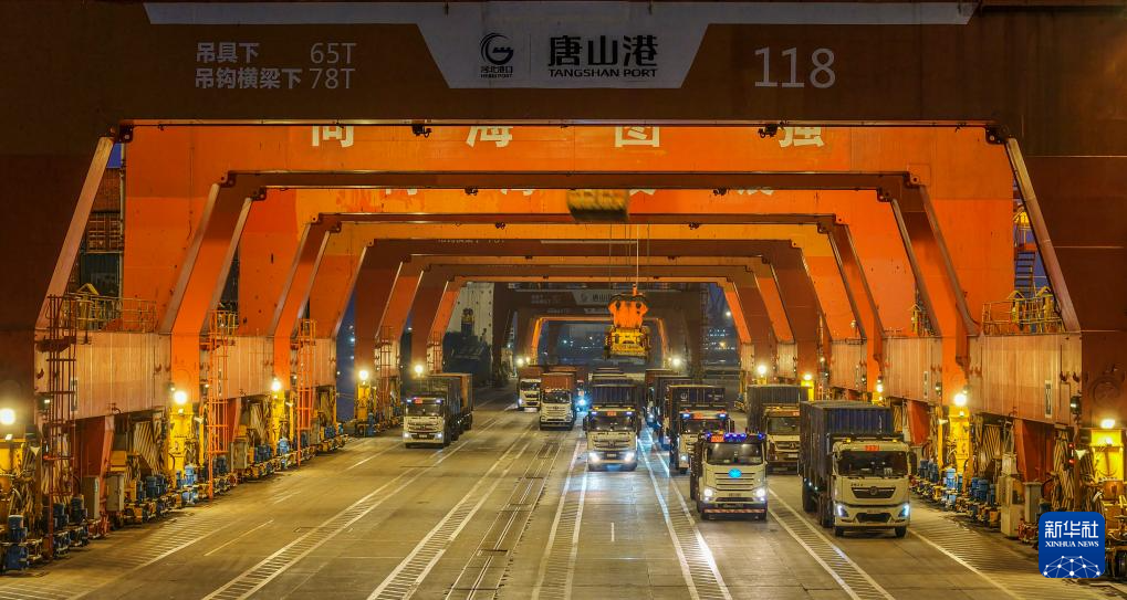 1月2日清晨,在河北省唐山港京唐港区集装箱码头,车辆在运输集装箱(无人机照片)。