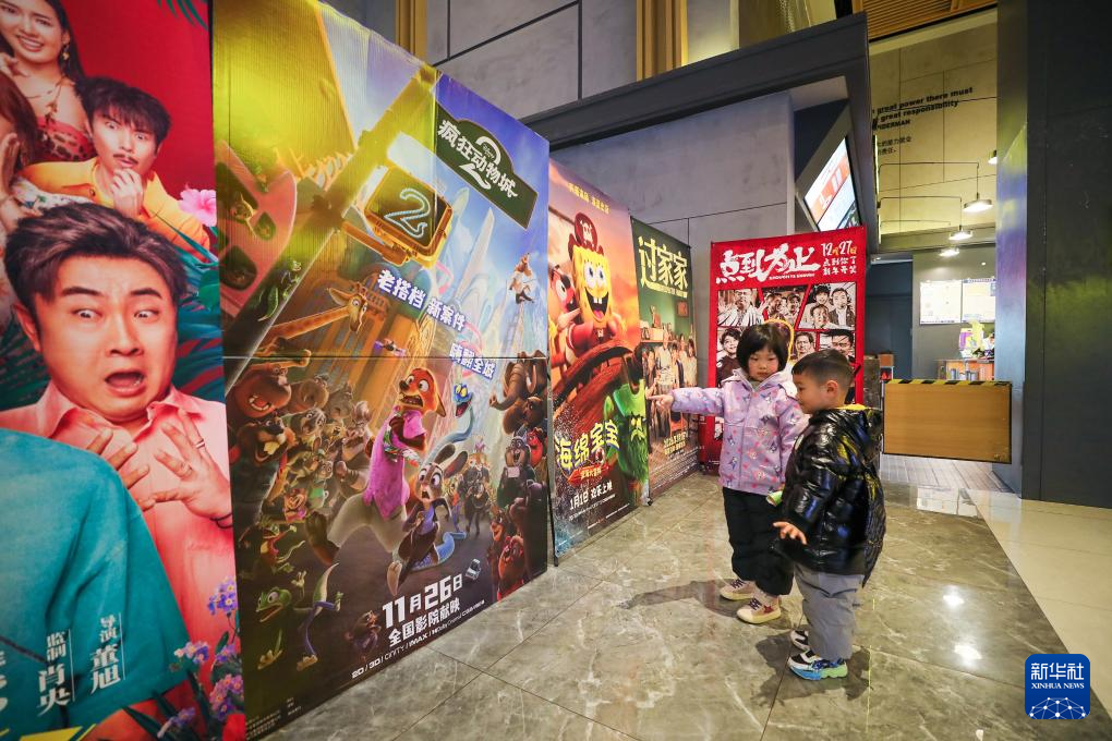 1月2日,江苏省海安市一家影城,两名小朋友在观看电影《疯狂动物城2》海报。