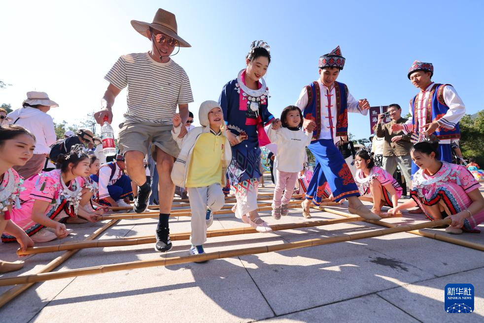 1月1日,游客在海南省三亚南山文化旅游区跳竹竿舞。