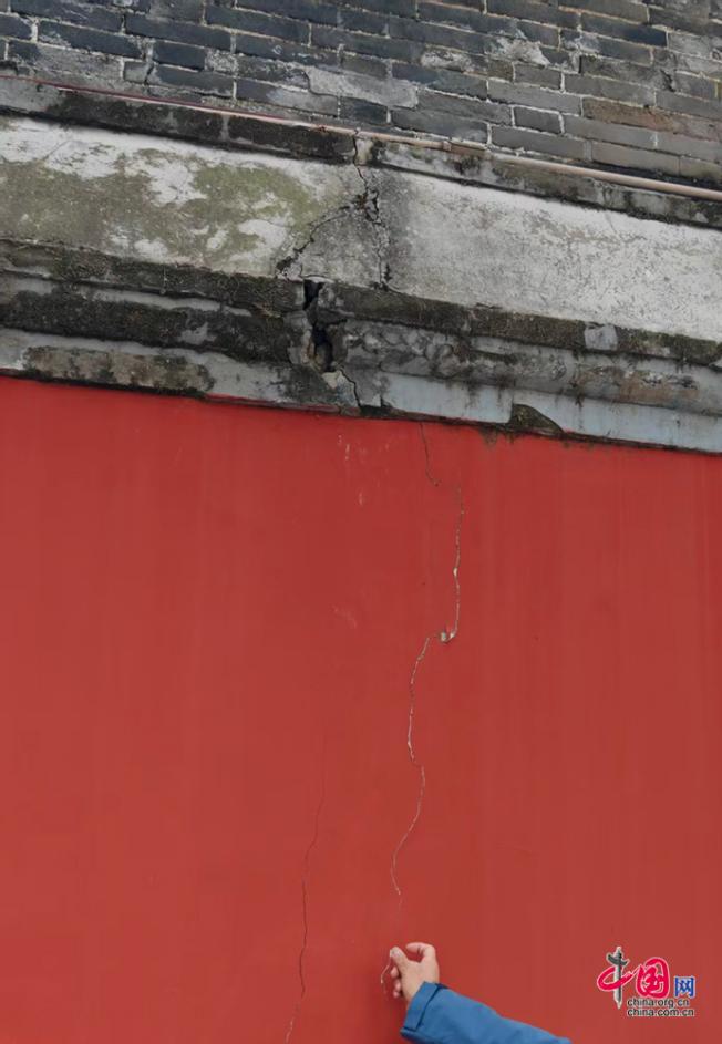 戒台寺依山势而建,院内依然能看到二十一年前山体滑坡带来的影响——倾斜的墙体和裂缝。