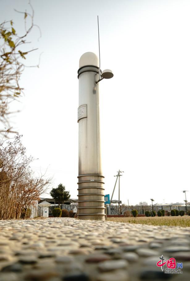 在北京市朝阳气象局院内的小广场上,矗立着一个高大的圆柱体。这是卫星导航基准站室外观测墩,属于北京市全球卫星定位综合服务系统——朝阳基准站。