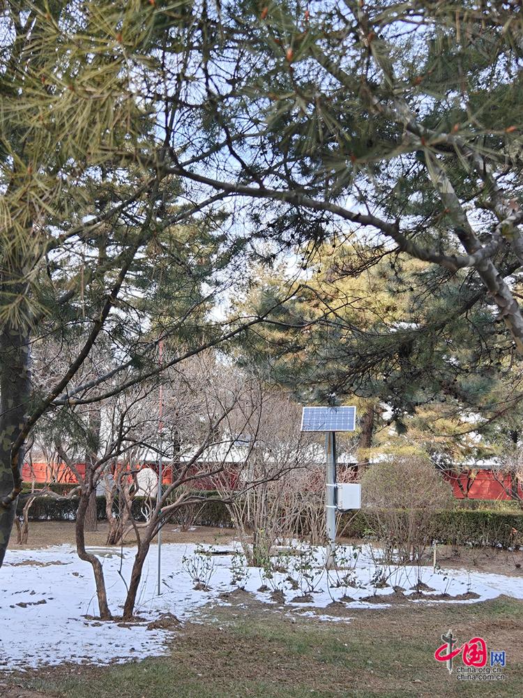 戒台寺内红墙绿树之间掩藏着的滑坡监测设备。 中国网 杨佳 摄影