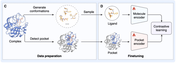 • 多尺度表征对齐: 团队通过训练两个深度神经网络编码器,将蛋白口袋的 3D 拓扑结构与小分子的化学表征映射到同一个高维共嵌入空间(Joint Embedding Space)。