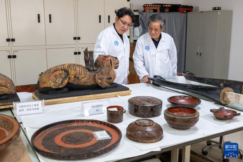 1月9日,在湖北荆州文物保护中心,荆州文物保护中心副主任吴昊(左)与父亲吴顺清查看近期正修复的虎座鸟架鼓。新华社记者 杜子璇 摄