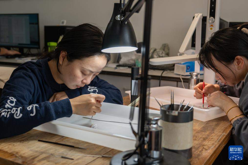 1月9日,在湖北荆州文物保护中心,工作人员对文物进行胎体修复。新华社记者 杜子璇 摄