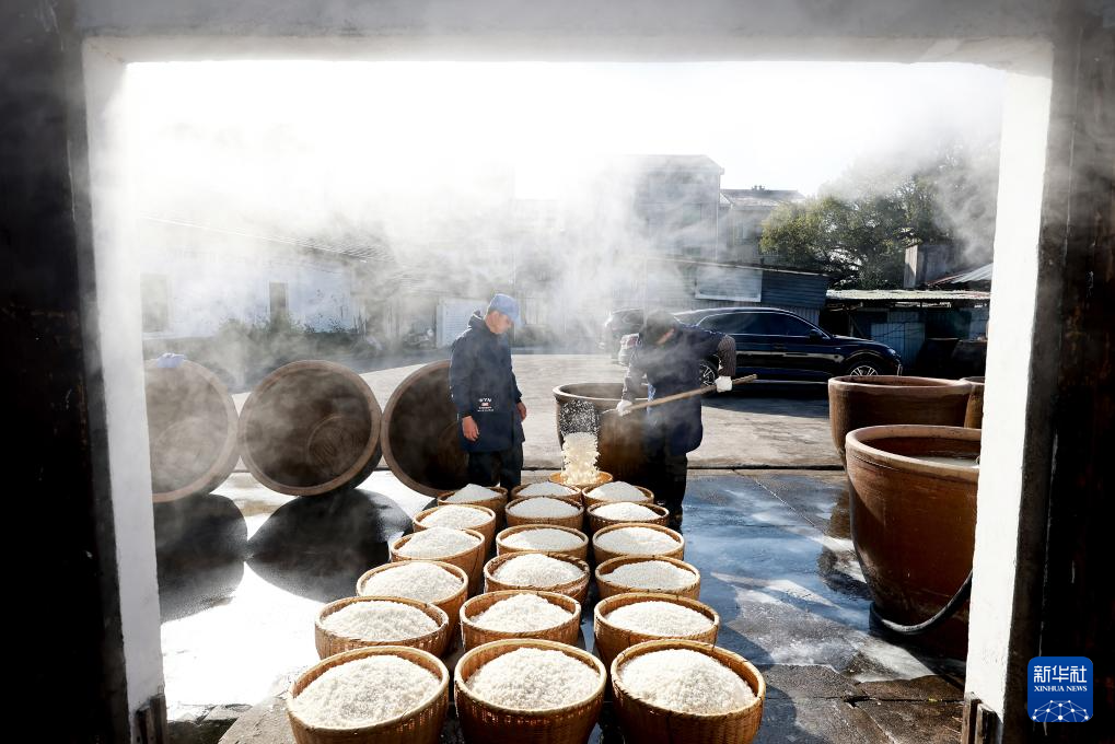 1月11日,在浙江省东阳市马宅镇屠梁村钟山自然村,酿酒师傅在捞米。