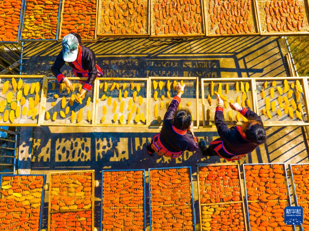 1月12日,广西金秀瑶族自治县忠良乡巴勒村村民在院落里晾晒红薯干(无人机照片)。
