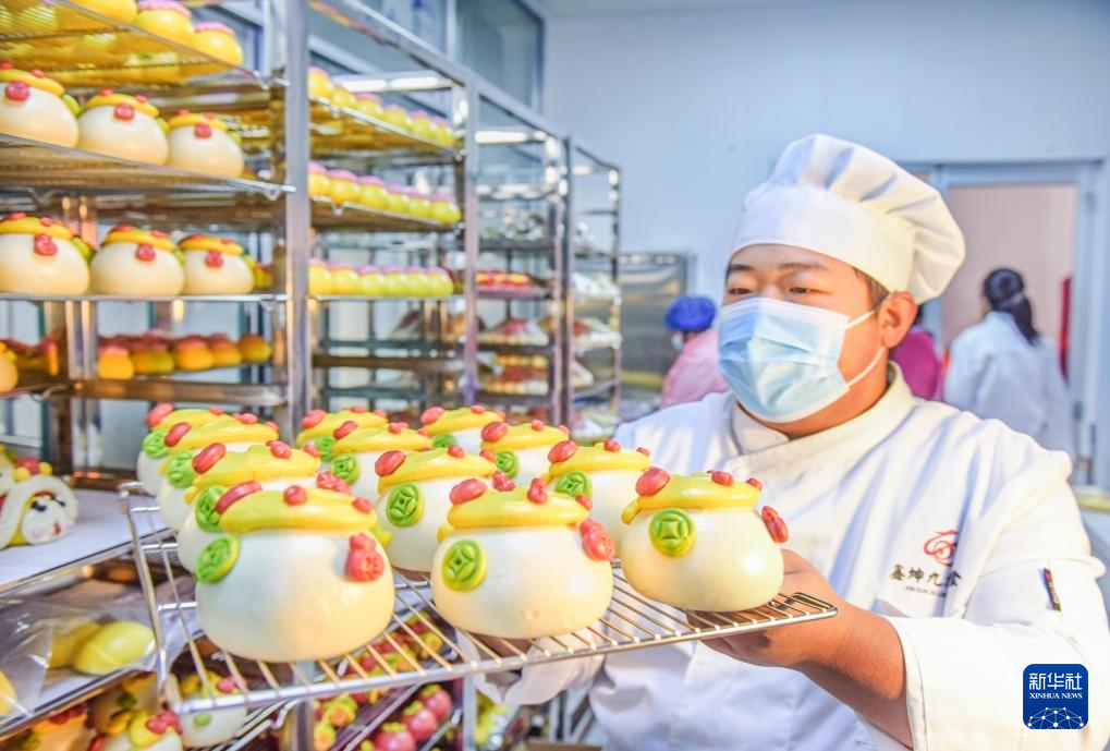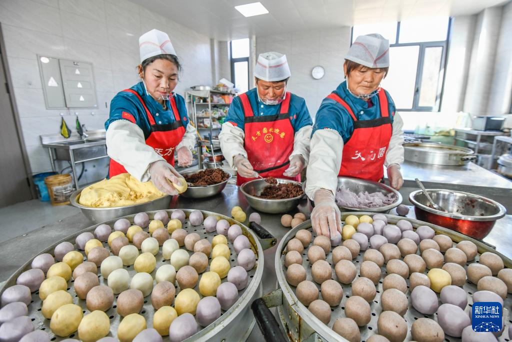 1月13日,工人在河北省遵化市娘娘庄镇一家面食加工厂包制黏饽饽。