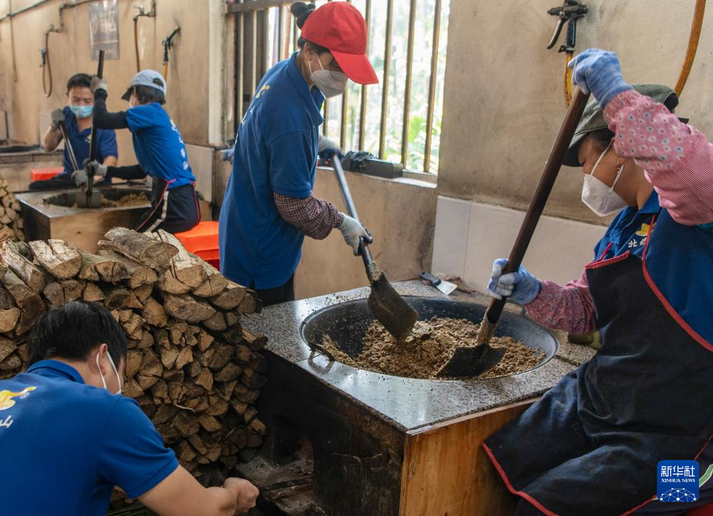 1月11日,海南省琼海市嘉积镇温泉村一家作坊工作人员在翻炒山柚籽粉。