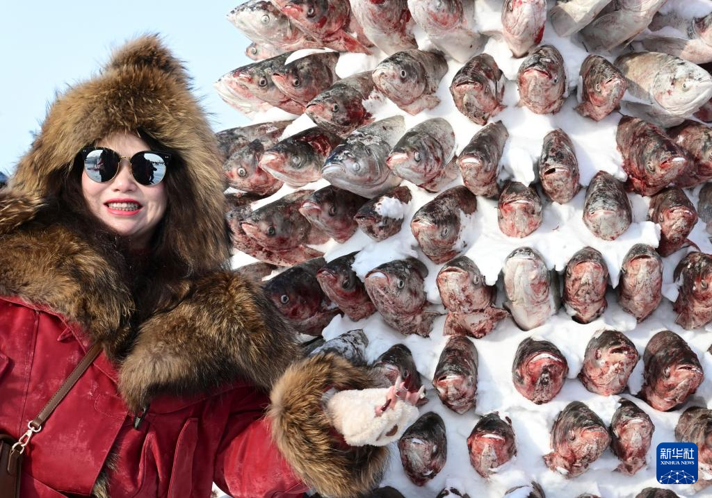 1月10日,在黑龙江省肇东市大似海冬捕渔猎文化节上, 游客在“冻鱼塔”前留影。