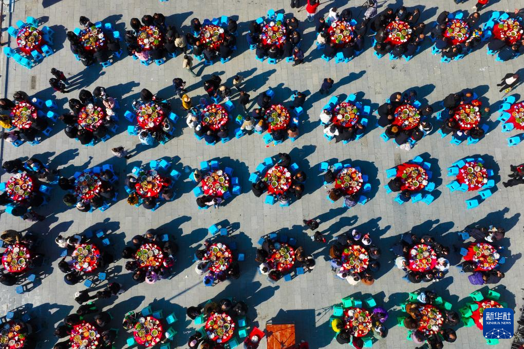 1月11日,游客在重庆市黔江区第二届武陵黑猪乡村文化节上享受武陵黑猪刨汤宴(无人机照片)。