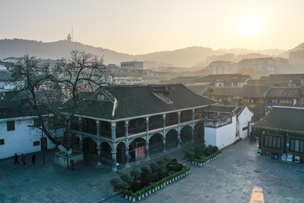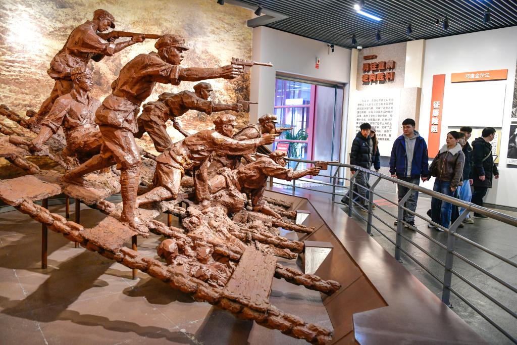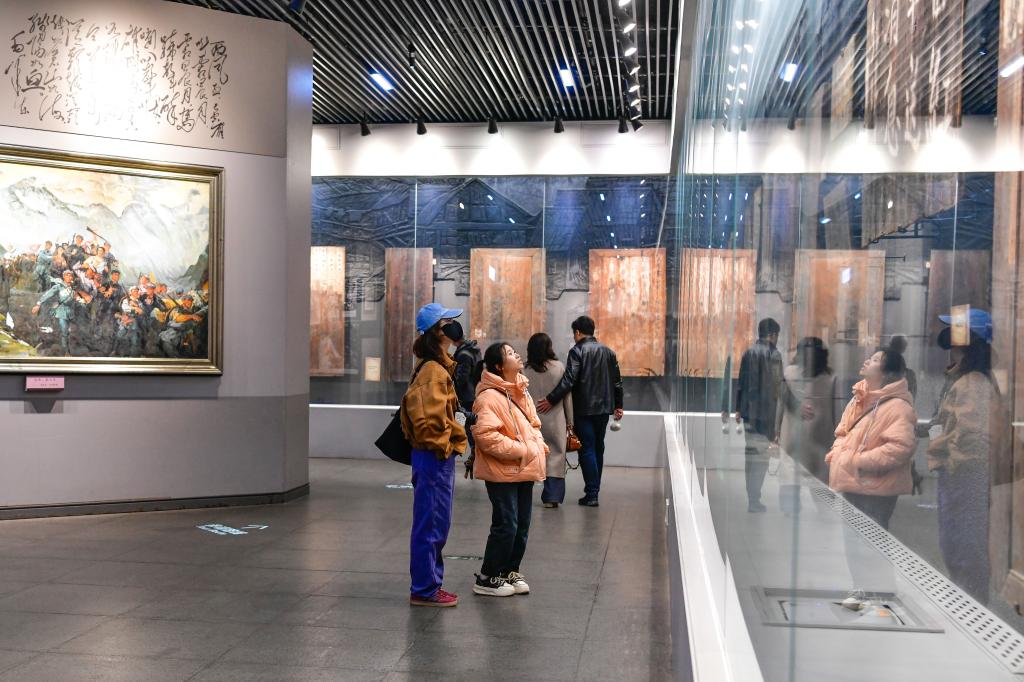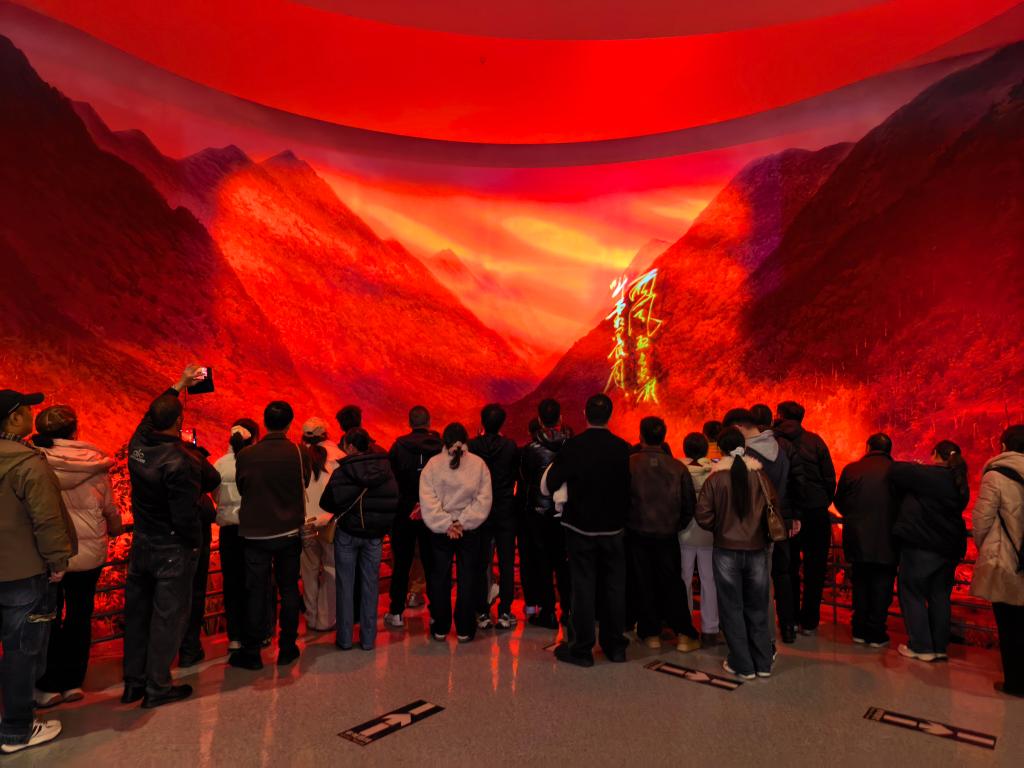 1月13日,游客在遵义会议陈列馆观看数字化体验历史复刻场景。