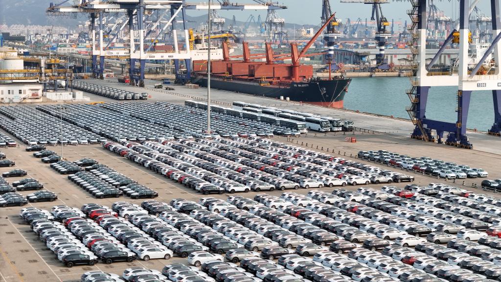 1月14日,大批国产汽车在山东港口烟台港集结等待装船出口(无人机照片)。新华社发(唐克 摄)