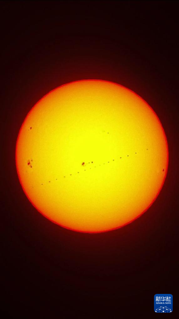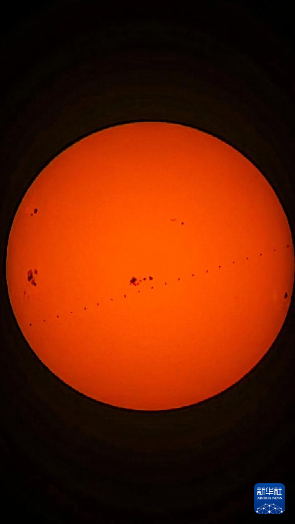 1月16日,在北京丰台花园拍摄的中国空间站飞过太阳的过程(堆栈合成照片)。